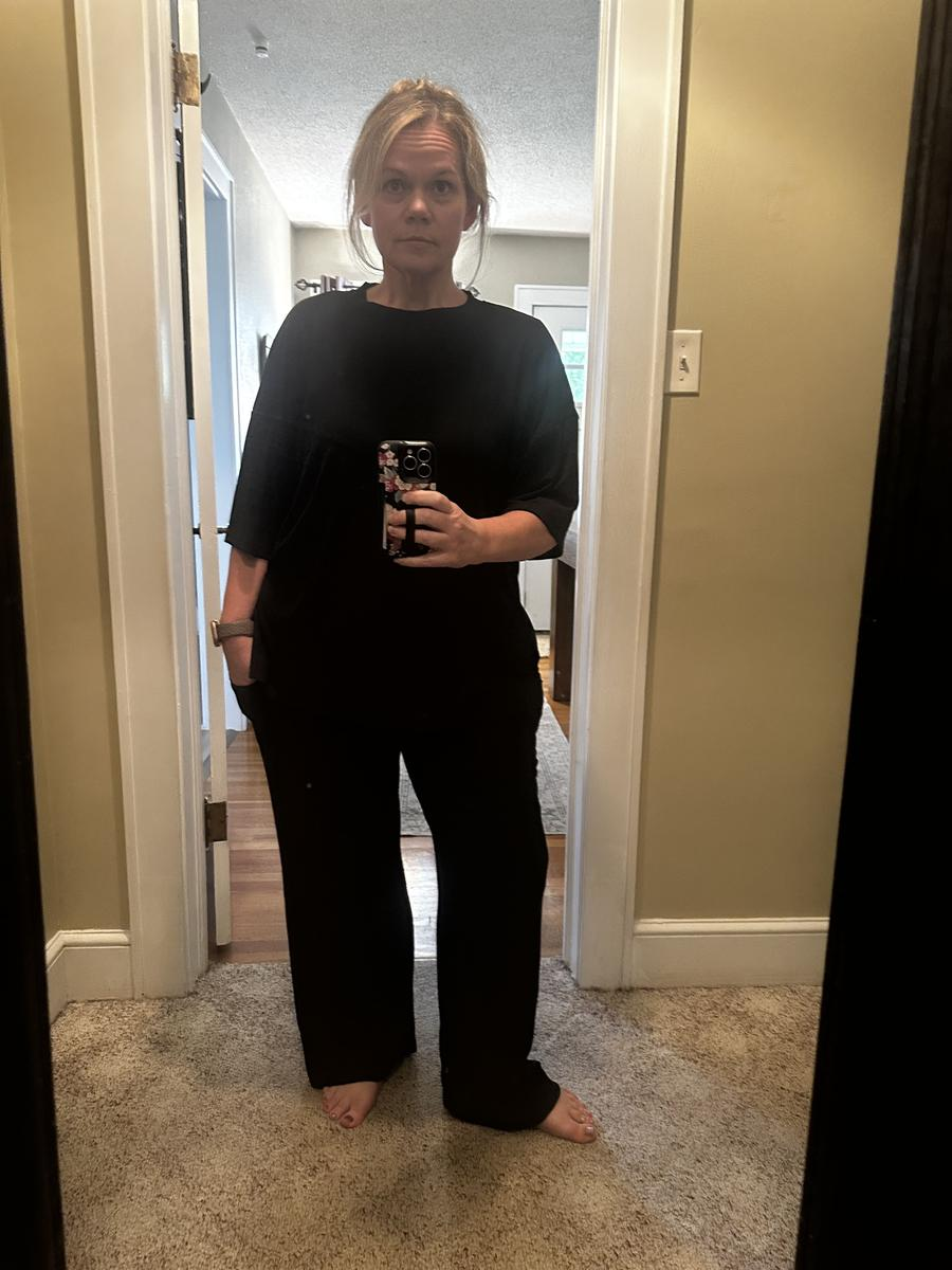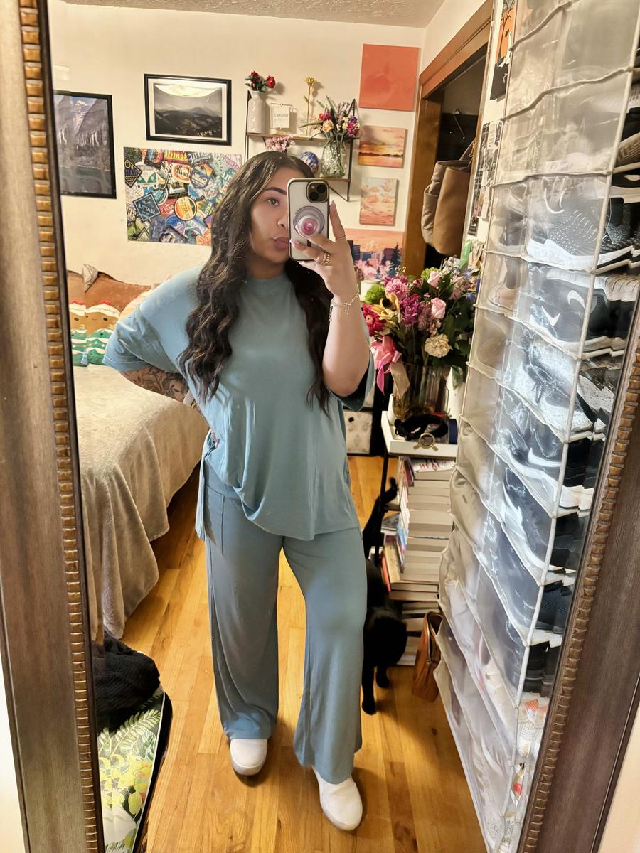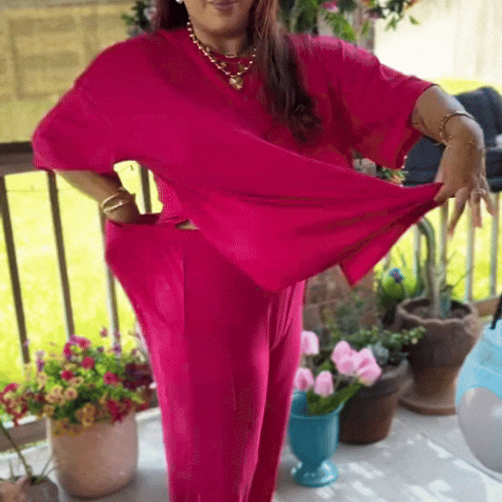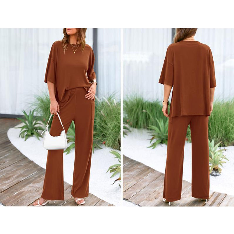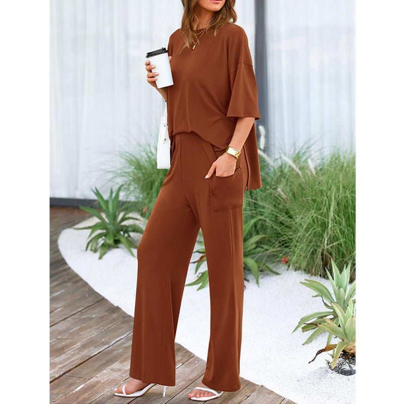 This chic two-piece set offers an effortless blend of comfort and style, featuring a loose-fitting top and wide-legged pants. The relaxed silhouette ensures ultimate comfort while maintaining a polished look, perfect for both casual outings and cozy lounging at home.