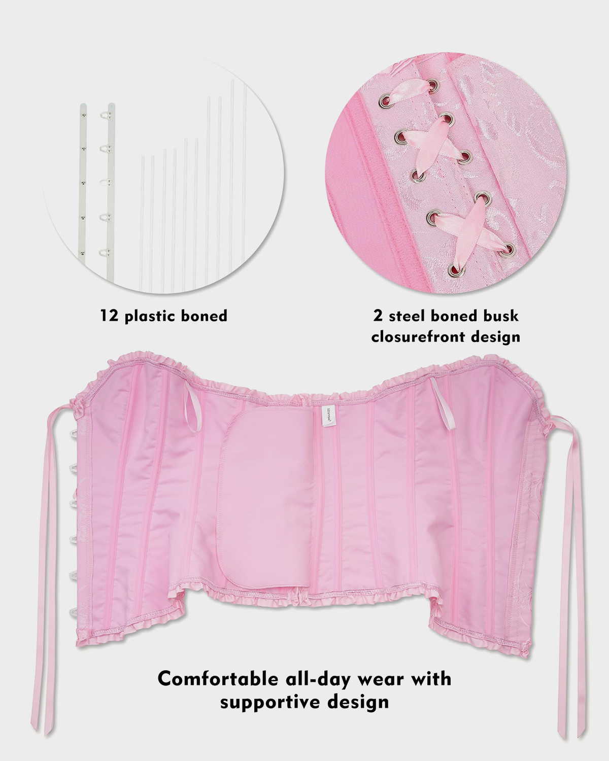 - Soft, lightweight, breathable fabric molds to the body, and 12 plastic bones provide spine support and make you feel comfortable and confident.