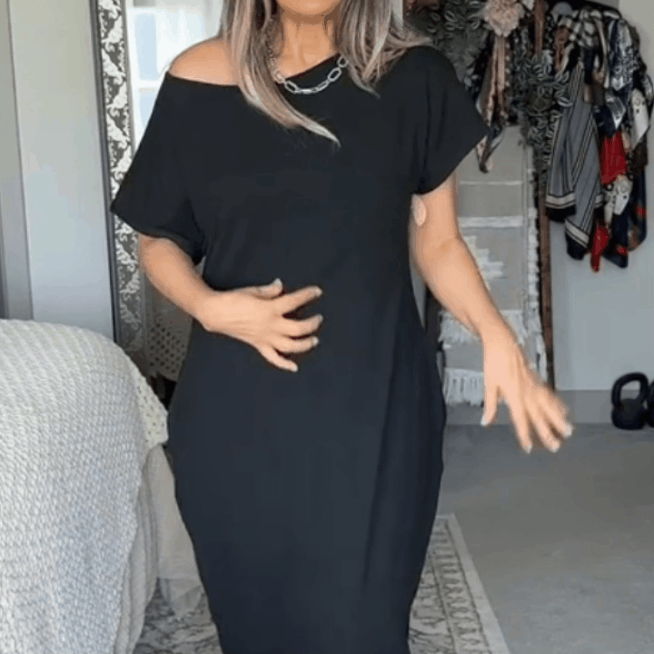 Designed with a chic off-shoulder neckline and relaxed batwing sleeves, this dress offers a roomy, flowy fit with graceful movement.The maxi length skims the body without clinging, while discreet side pockets keep essentials close.Universally flattering, wrinkle-resistant, and easy to pack, it’s perfect for daily wear or vacation getaways.