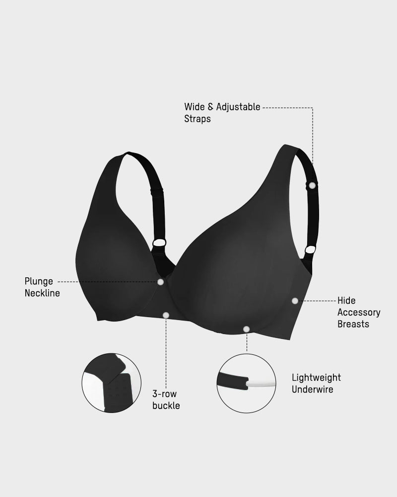 Distribute weight evenly to erase shoulder pressure and slipping.Heightened Side Design: The high-side design helps control and smooth out side bulges (or "side boob"), giving you a more streamlined bustline.Seamless Back Closure: A 3-row seamless back clasp allows for customized snugness.